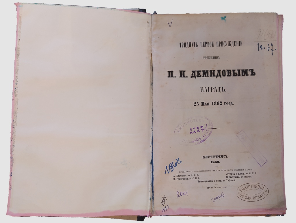 Книга «Тридцать первое присуждение учрежденных П.Н. Демидовым наград 25 мая 1862 года».