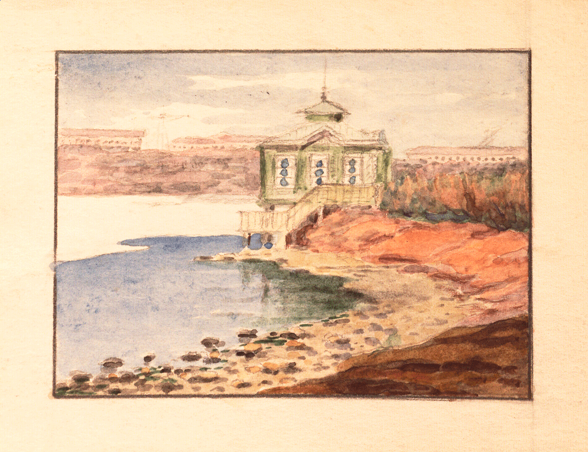 Хорошо прорисована открытая беседка на берегу весной. Заметен берег, широкой полосой укрепленный бутовым камнем. На заднем плане – деревянный Тагил с собором.