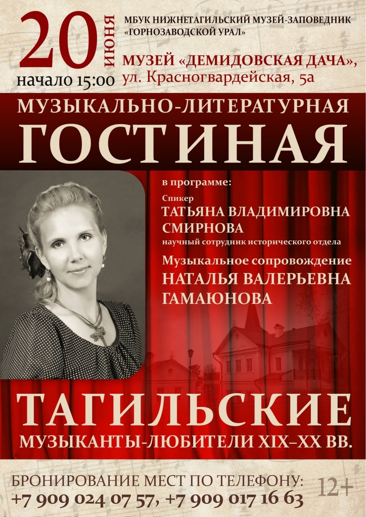 20 июня на Демидовской даче пройдет музыкально-литературная гостиная, посвященная любителям музыки, жившим в Нижнем Тагиле в XIX – начале XX веков. Кем они были? Чем жили и какую музыку исполняли? Об этом расскажет научный сотрудник музея-заповедника Татьяна Владимировна Смирнова.